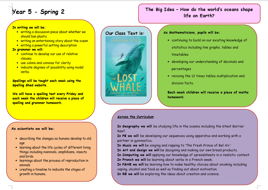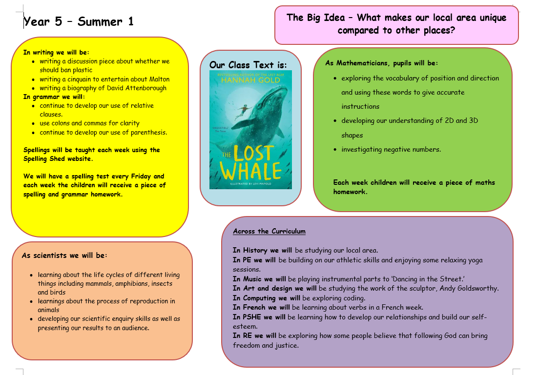 In Year Five, we will be building on of all the key skills taught so far. We will read a really extensive and exciting range of books taking us on a journey from Malawi via New York and Ancient Greece. We will experience an interesting range of excellence texts which will inspire us to write our own stories, setting descriptions, letters, newspaper reports and non-chronological reports.