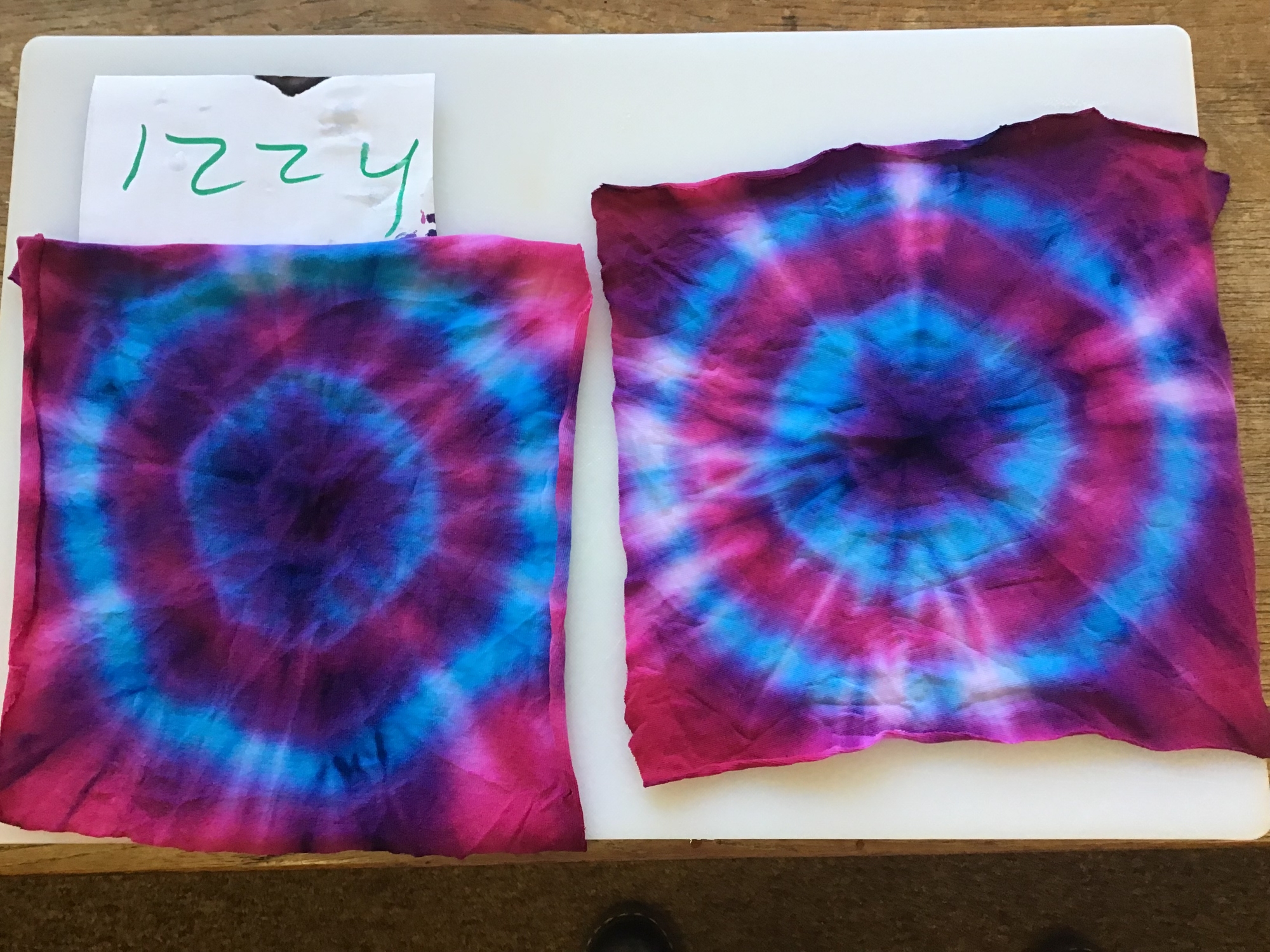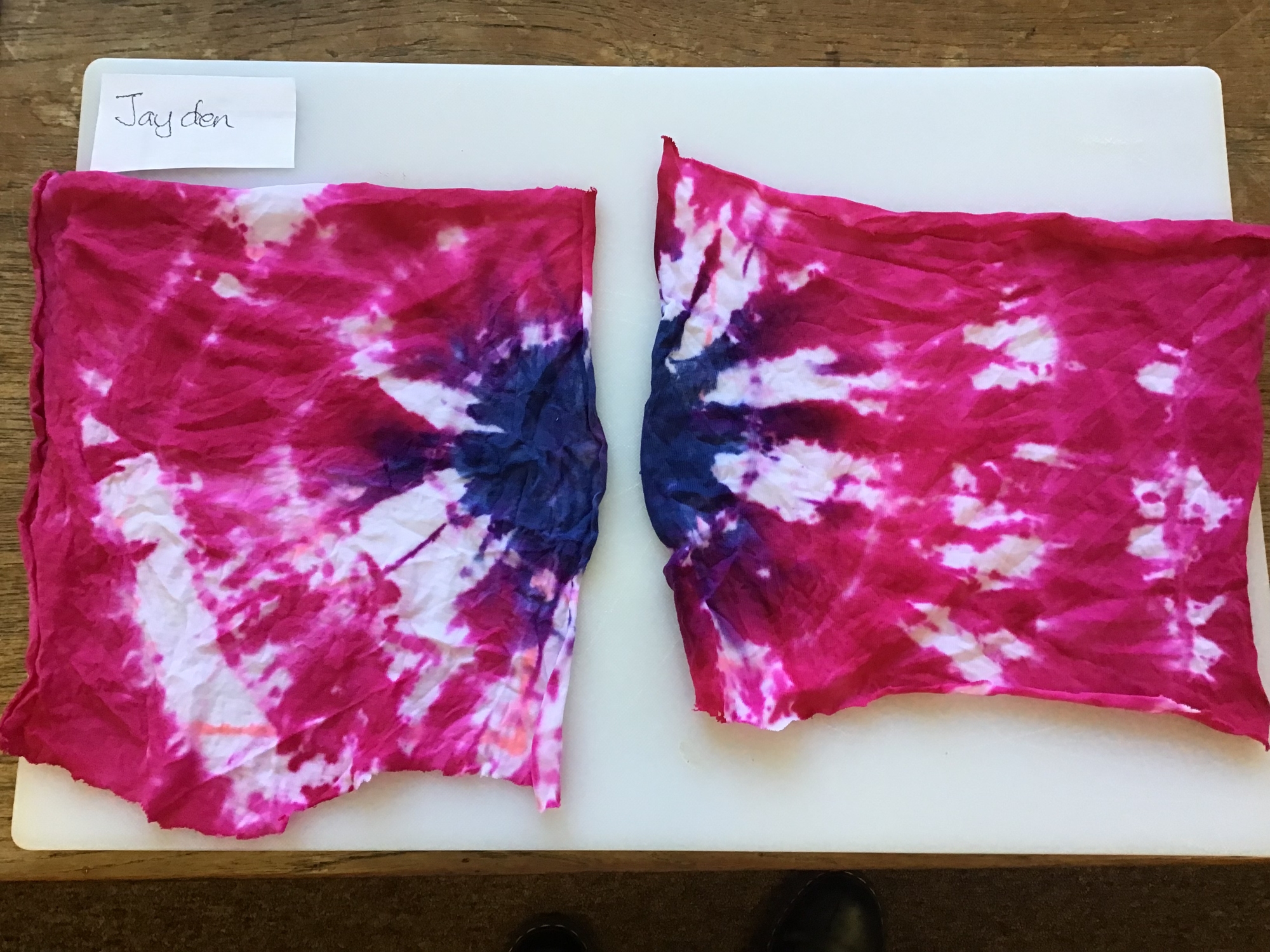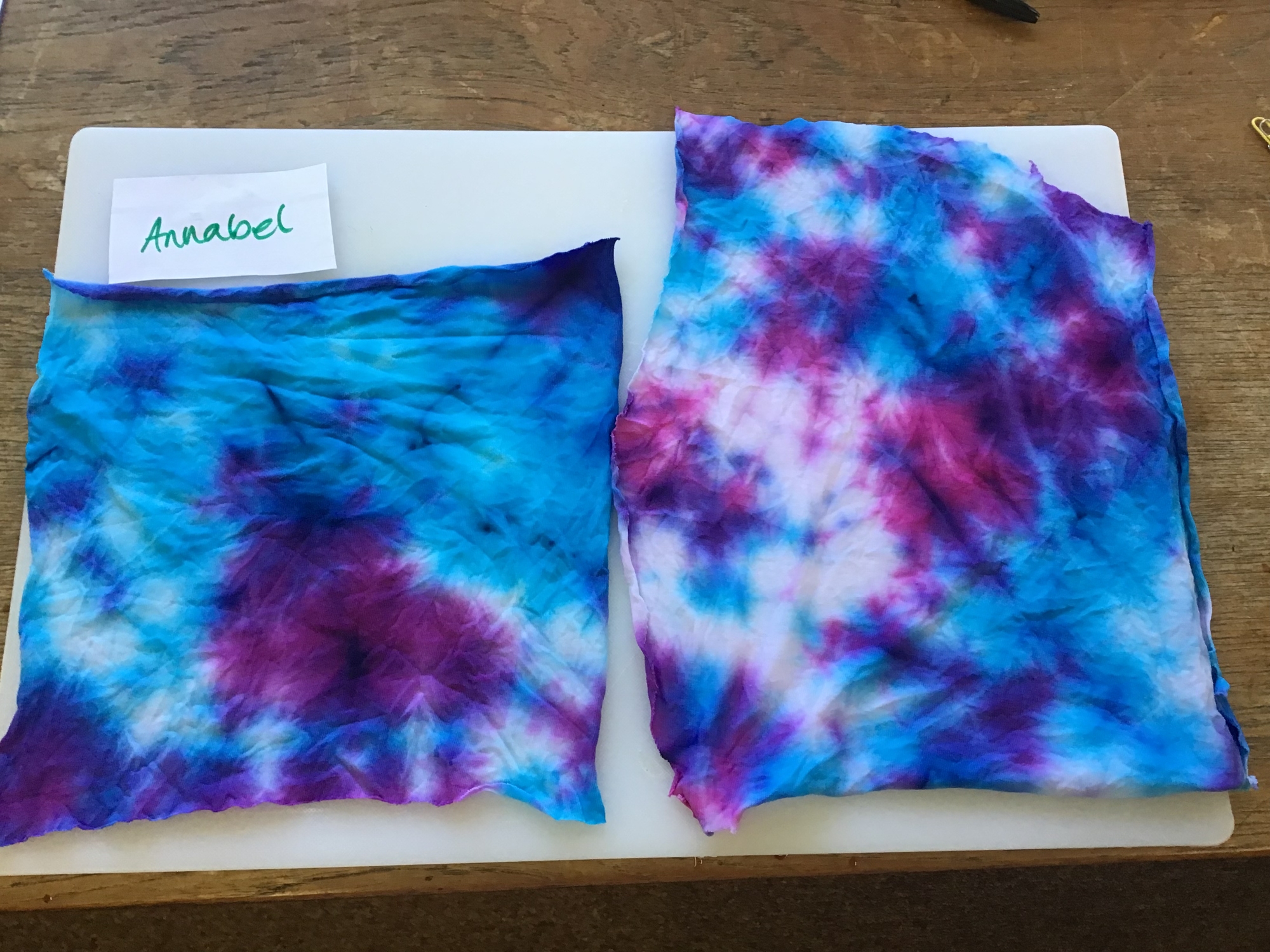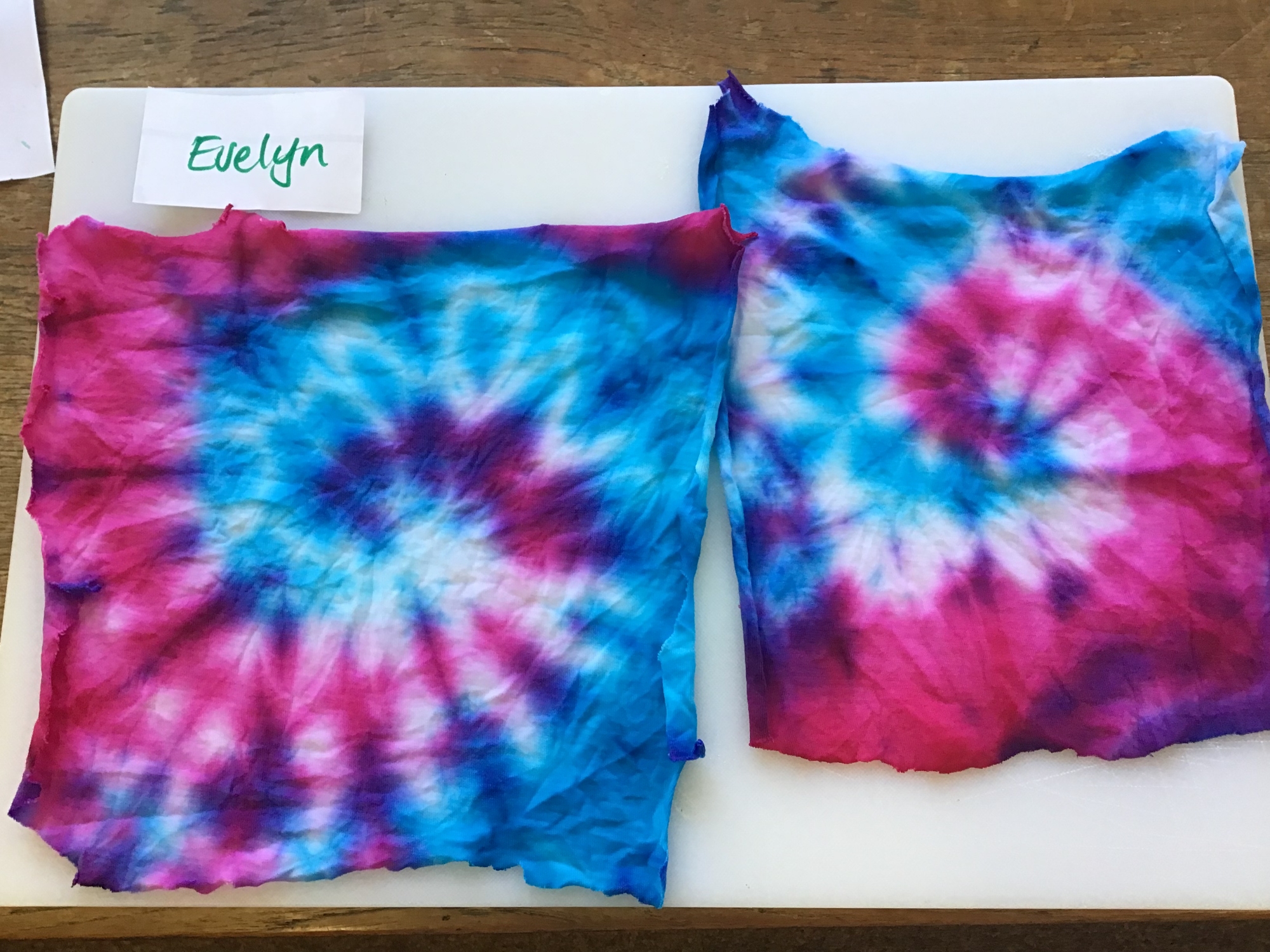 Here are just some of our brilliant dyed fabrics! Our fabrics have been cut, twisted, tied and dyed and are ready to be sewn into a cushion. We thoroughly enjoyed twisting and tying the fabric and then applying the dye. We are really pleased with the outcome!