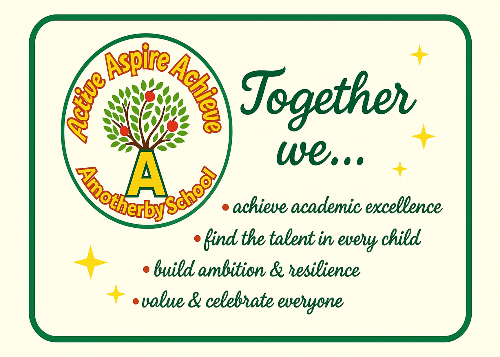 At Amotherby School, our vision is to inspire every child to be active in their learning, aspire to reach their full potential, and achieve excellence in all they do. We believe that fostering a love of learning, alongside a supportive and inclusive environment, enables our students to grow in confidence and ambition. Our core values of Active, Aspire, and Achieve guide us in nurturing well-rounded individuals who are not only academically successful but also equipped with the skills and mindset to thrive in the wider world. We are committed to providing a space where every child can realise their dreams, overcome challenges, and celebrate their achievements.
